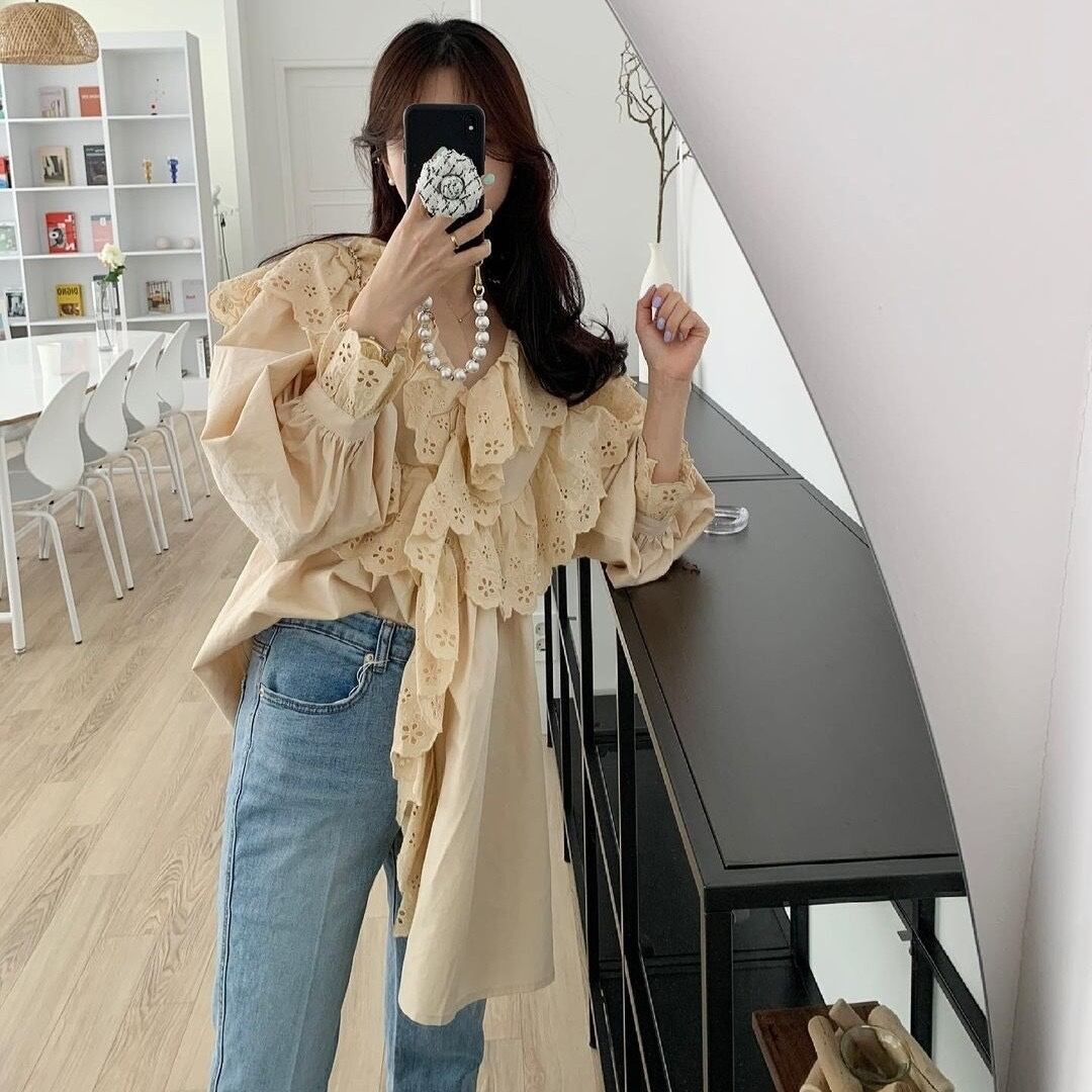 レースブラウス シャツ フレア 長袖 レディーストップス 大人可愛い カジュアル