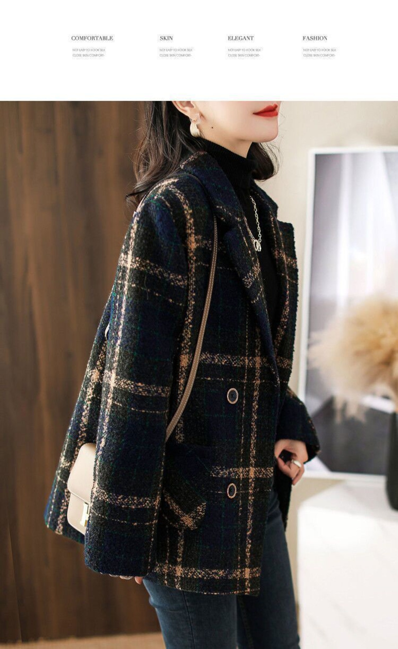 ・落ち着いた秋冬カラーのチェック柄チェスターコート。