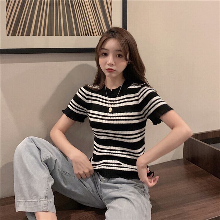 韓国ファッション スリム ギャザリング ニットトップス 減齢 ボーダー