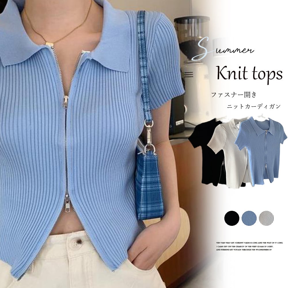カーディガン トップス へそ出し サマーニット Vネック ファスナー ベーシック 大人コーデ 半袖 通勤 着やせ