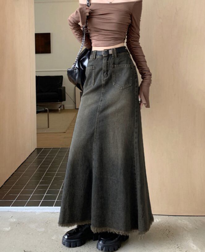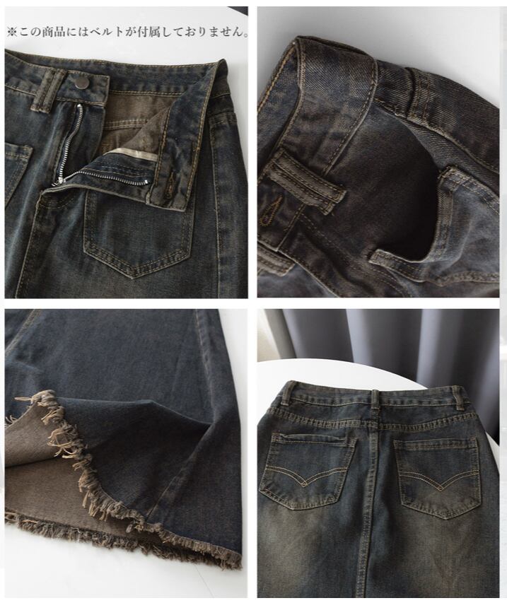 レディース ハイウエスト ヴィンテージ デニムスカート ブリーチ Aラインスカート 体型カバー カジュアルロングスカート